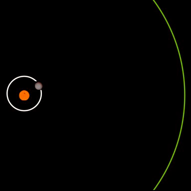 TOI-5007 b Расстояние в перицентре - 0.027 а.е. Расстояние в апоцентре - 0.033 а.е. Радиус эффективной земной орбиты (показана зеленым цветом) - 0.28 а.е. Средняя плотность планеты оценивается в 0.87 ± 0.13 г/куб.см, эффективная температура - в 782 ± 21 К.