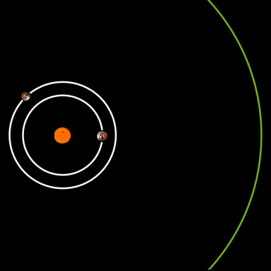 TOI-5489 b TOI-5489 c Радиус эффективной земной орбиты (показана зеленым цветом) - 0.16 а.е. Орбиты планет отрисованы в предположении нулевого эксцентриситета.