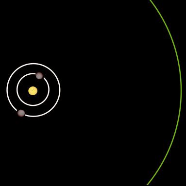 TOI-1232 b TOI-1232 c Радиус эффективной земной орбиты (показана зеленым цветом) - 1.09 а.е. Средняя плотность планеты b оценивается в 0.93 +0.17/-0.13 г/куб.см, эффективная температура - 849 К.
