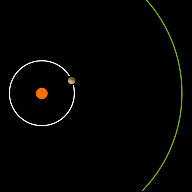 TOI-1243 b Радиус эффективной земной орбиты (показана зеленым цветом) - 0.19 а.е. Орбита планеты отрисована в предположении нулевого эксцентриситета.